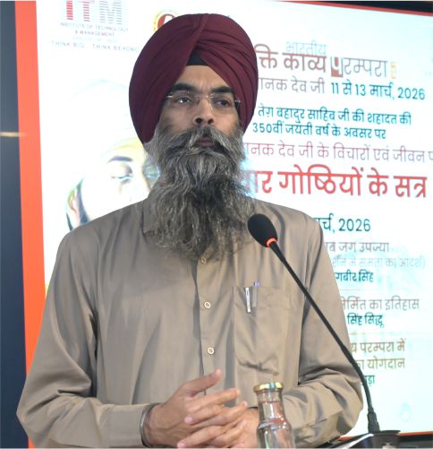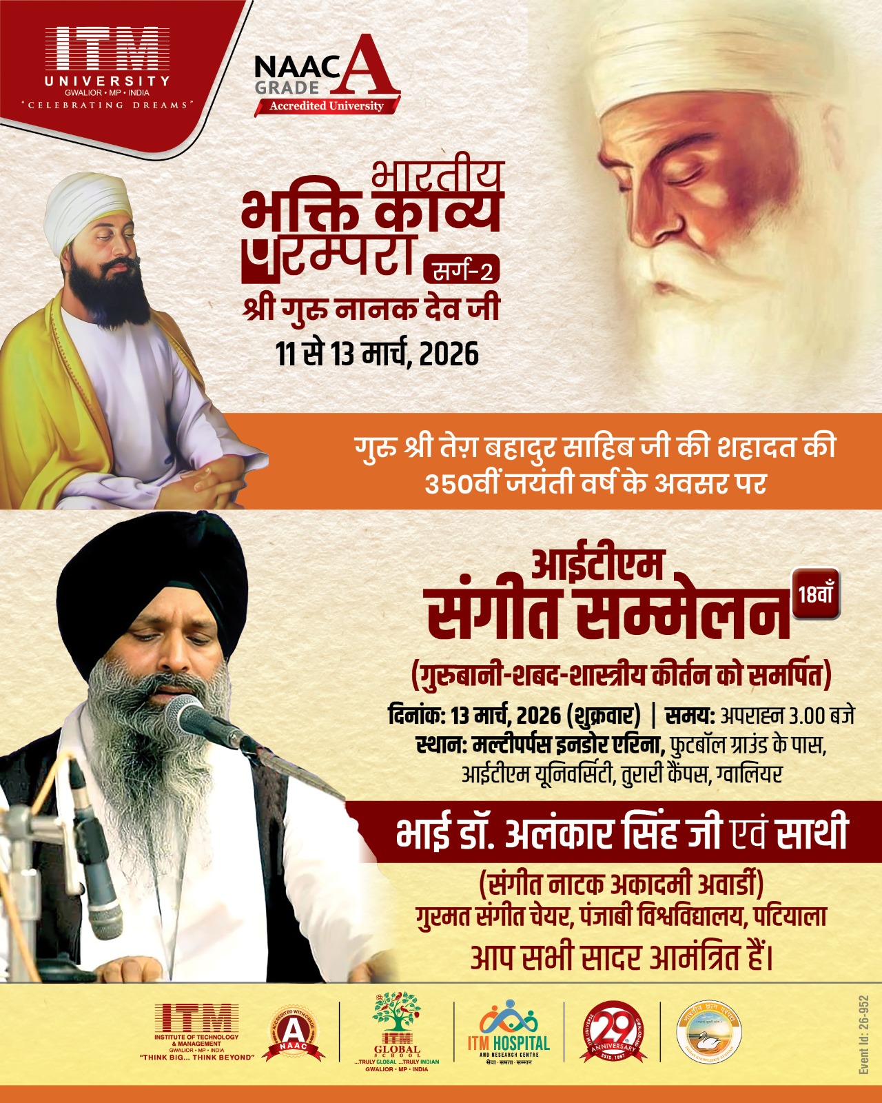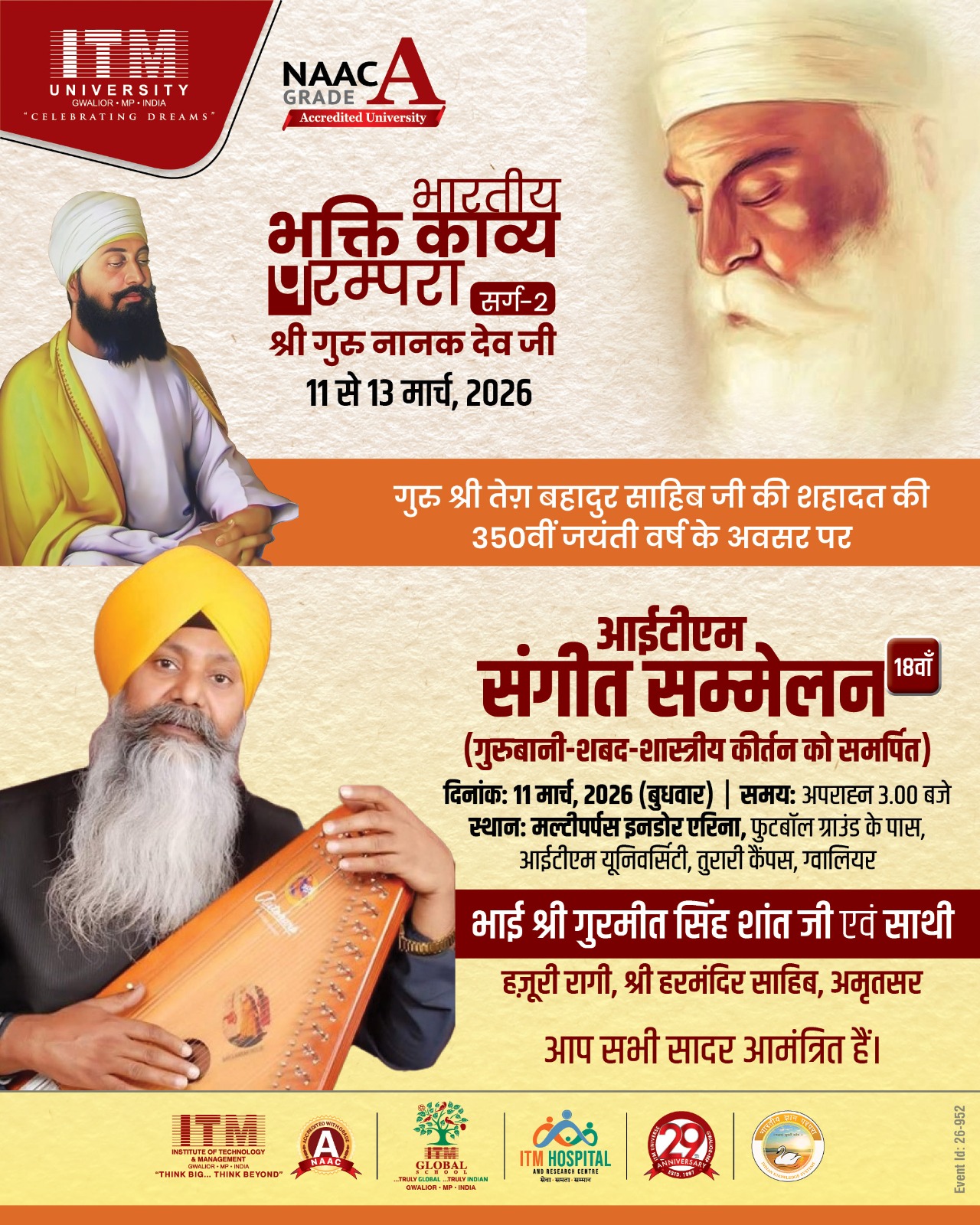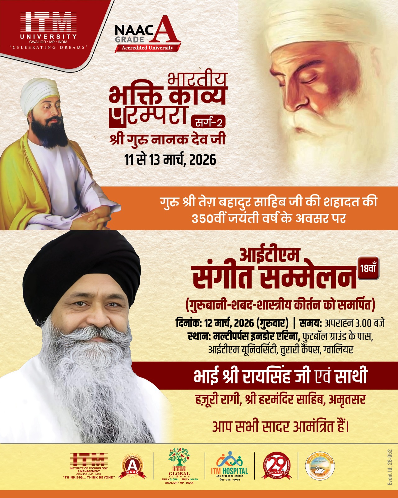 आईटीएम विश्वविद्यालय, ग्वालियर द्वारा गुरु श्री तेग बहादुर साहिब जी की शहादत की 350वीं जयंती वर्ष के अवसर पर ‘भारतीय भक्ति काव्य परम्परा : श्री गुरु नानक देव जी’ विषय पर एक विशेष तीन दिवसीय कार्यक्रम का आयोजन दिनांक 11 से 13 मार्च 2026 तक किया गया। इस आयोजन का उद्देश्य गुरु नानक देव जी के जीवन, विचारों तथा भारतीय भक्ति परम्परा में उनके अमूल्य योगदान को व्यापक रूप से प्रस्तुत करना था। कार्यक्रम के अंतर्गत विद्वत् विचार-गोष्ठियाँ एवं आईटीएम संगीत सम्मेलन का आयोजन किया गया, जिसमें प्रतिष्ठित विद्वान एवं गुरमत संगीत के सुप्रसिद्ध कलाकारों द्वारा सहभागिता की गई।