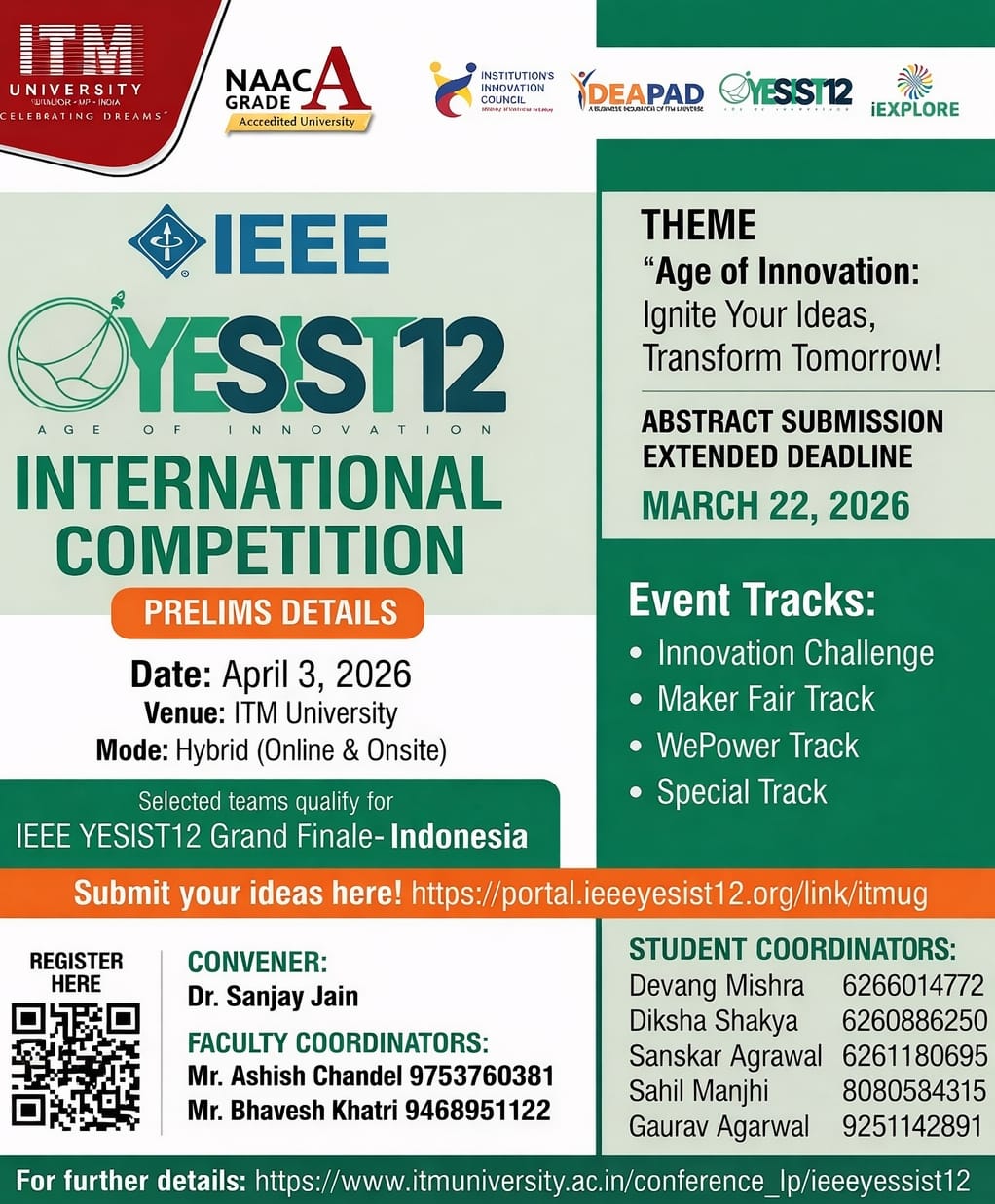 Convener – IEEE YESIST12 2026 (Prelims), ITM University, Gwalior