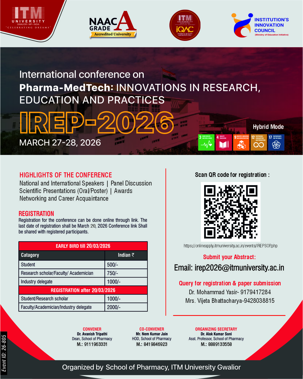 IREP 2026 explores the evolving landscape of pharmacy through the theme “Pharma MedTech: Innovations in Research, Education, and Practice for the Next Generation of Care.” The conference aims to bring together pharmacy professionals, educators, researchers, and students to deliberate on recent advances in drug discovery, pharmaceutical practice, and education.